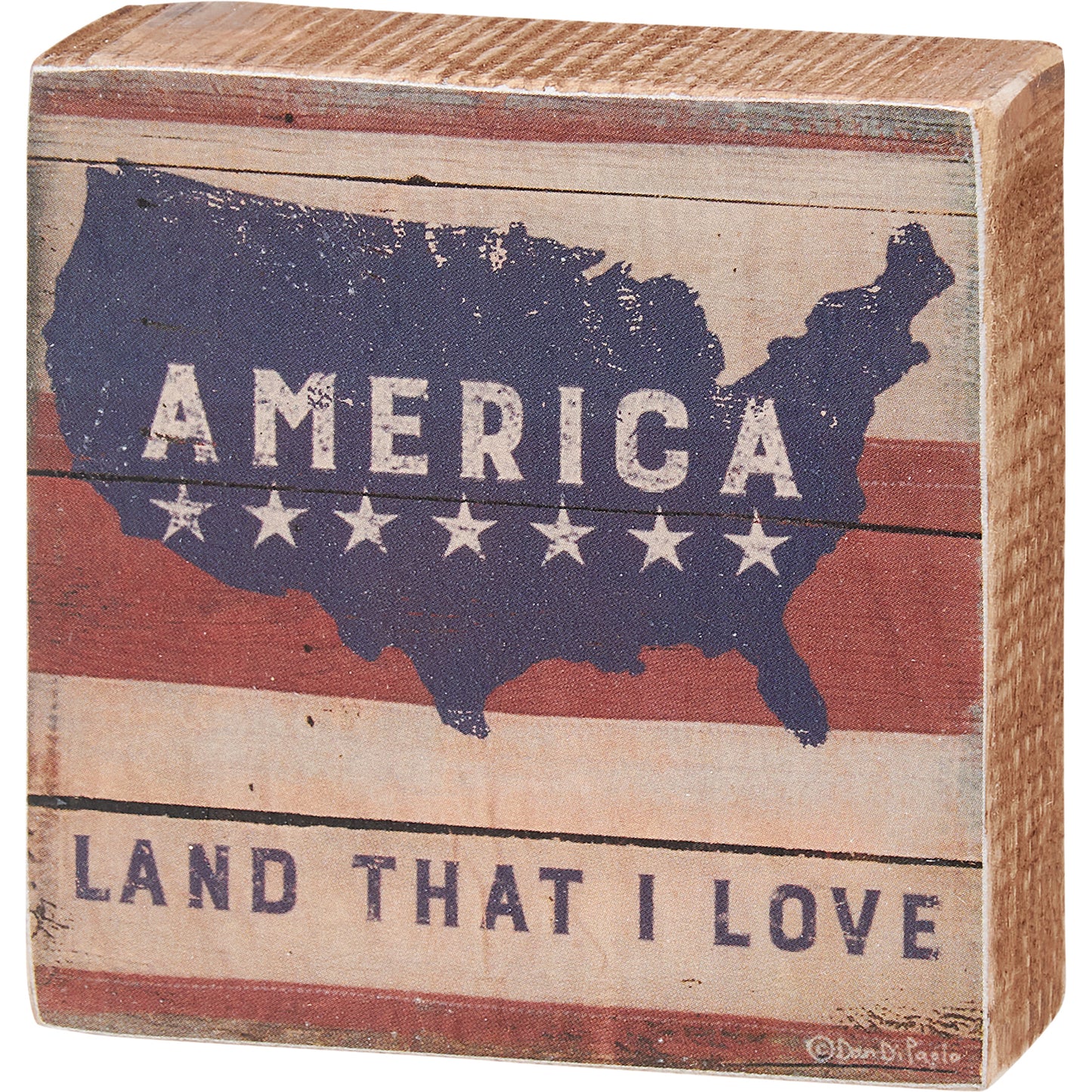 A rustic block sign displaying "America Land That I Love" sentiment with unique stars and stripes design and slat wood accents. Design features USA silhouette in a patriotic blue color behind sentiment. Our America Land That I Love block sign is easy to hang via predrilled keyhole slot or can free-stand alone