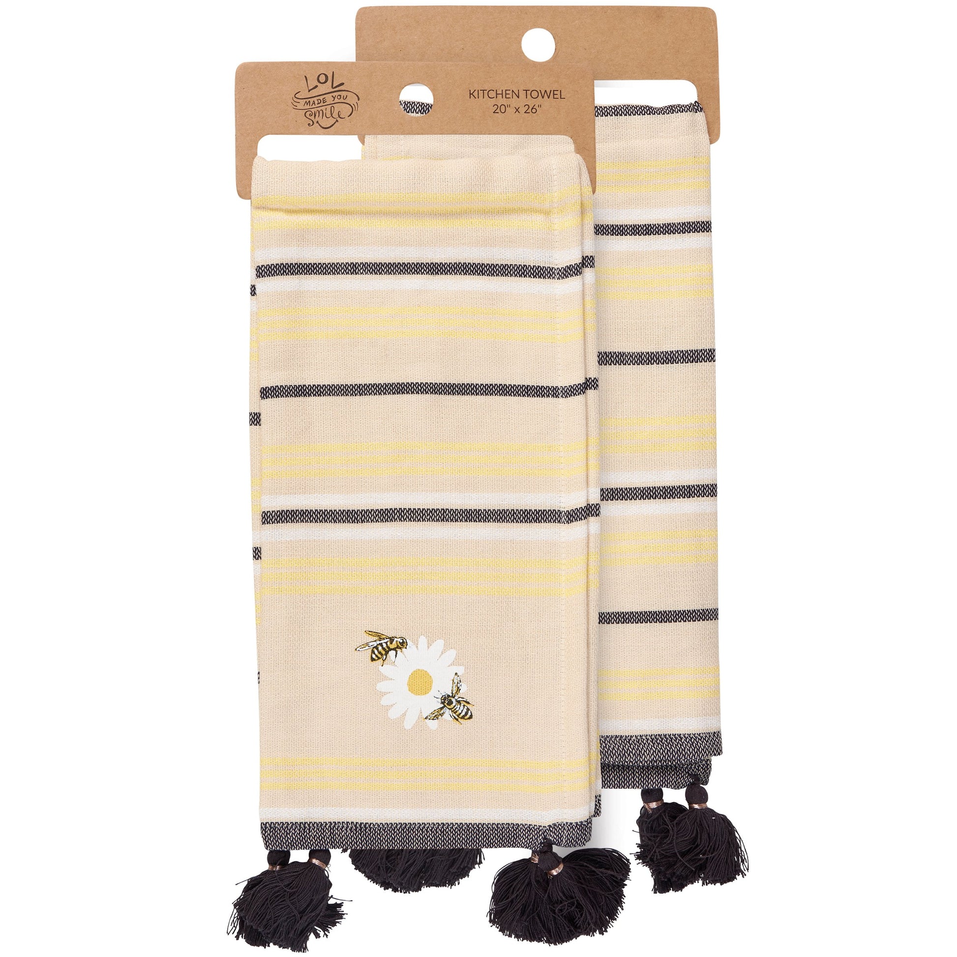 A cotton-linen blend kitchen towel displaying coordinating colored stripes woven throughout with a bees on daisy design on the front. Kitchen towel features black tassels along the edge. Our Bees kitchen towel is conveniently machine-washable for easy cleaning. Packaged on a cardboard hanger with hole to easily display on rack. A homestead inspired kitchen accessory perfect for everyday use.