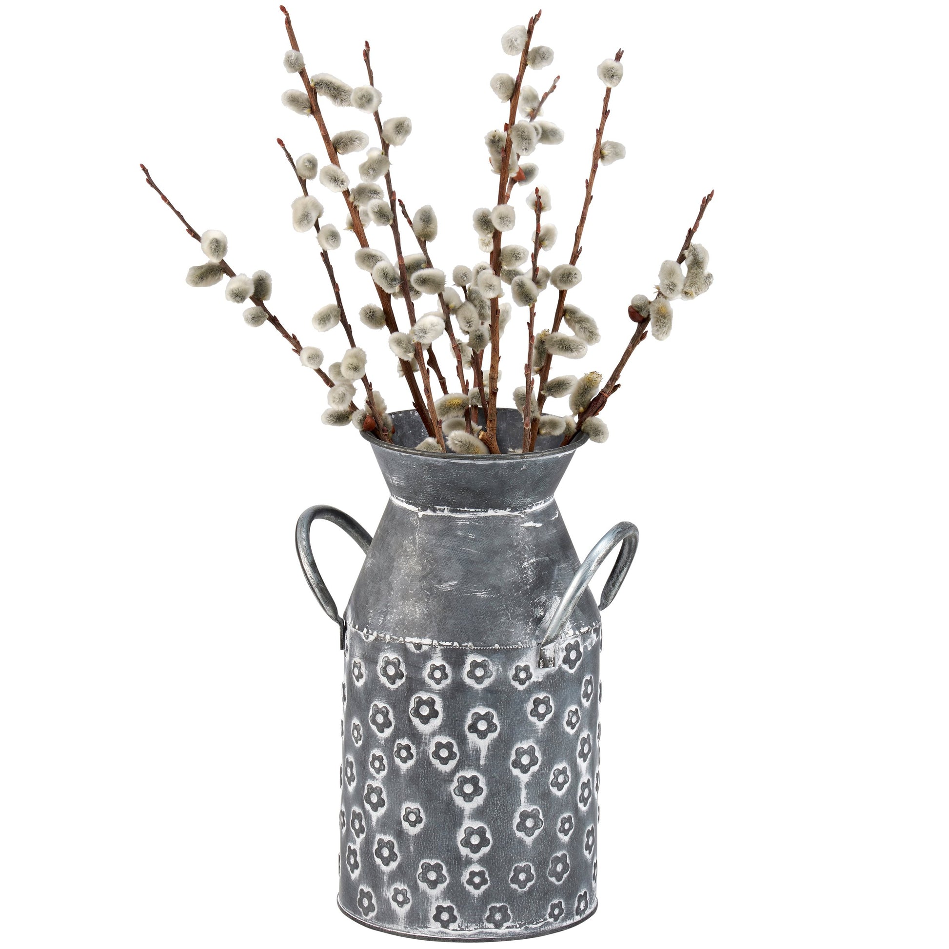 A galvanized metal planter displaying a vintage milk jug design with embossed daisy designs and dry brushed paint accents. Our Daisy Milk Jug planter is perfect for displaying greenery in a rustic style vessel. Greenery pictured not included. A simple everyday home accent that coordinates with a variety of décor